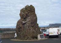 of the An early name for Ballycastle is said to have been Port Brittas, it was from there that the Dalriadans (A local tribal group) sailed to and collonised parts of western Scotland, in 506 led by the chiefs Angus and Fergus, tradition related that they took with them the Lia Fail or stone of fate, on which Irish Monarchs were crowned at Tara in county Meath, almost eight centuried later in 1296 the Lia Fail was taken from Scone in Scotland to Westminster Abbey, London by Edward I. The above mentioned Fergus is probably the same who gave his name to the town of Carrickfergus when his galley was wrecked and he drowned in 530 AD. At the north end of the town near