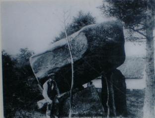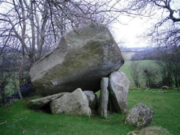 locally as Pat Kearney's big stone Excavations in 1834 unearthed a cremation urn and a flint arrowhead, the capstone is 13 feet (4.0m) long it has slipped from its original position, it is estimated to weigh somewhere in the region of fifty tons. In 1834 a cremation urn and a flint arrowhead were found |