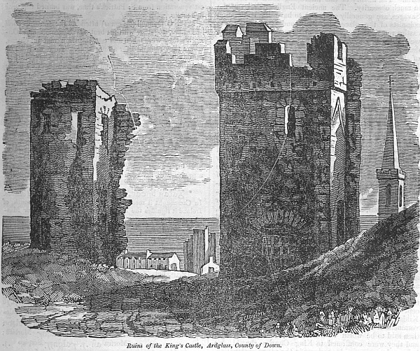 an original drawing by Mr. Nicholl, represents Here is also a long range of castellated houses, called by the inhabitants the New-works, and said to have been erected by Shane O'Neil about the year 1570. It stands boldly on a rocky shore of the bay, which washes it on the east and north sides, and extends 250 feet in length, and in breadth only 24; the thickness of the walls being three feet. Its design is uniform and elegant, consisting of three square towers, one in the centre and one at each end, each tower containing three apartments 10 feet square; the intermediate space is occupied by a range of 15 arched door-ways of cut stone, and 16 square windows--a doorway and a window being placed alternately next to each other all along the range, an arrangement which leaves no doubt that they were designed for shops or merchant's ware-rooms. There is a story over the shops, containing the same number of apartments, and each has its own separate stone staircase. The rooms on the ground floor were seven feet high; the upper rooms six feet and a half; and in each of these was a small water-closet, the flue of which runs down through the walls, and is washed at the bottom by the sea. They have no fire-place; and the merchants, as it would appear, were in the habit of using Horn Castle as their kitchen and dining hall. On the seaside there are no windows or apertures, except narrow loop-holes, a circumstance which, together with the centre and flanking towers, shows the secondary purpose of the building to have been a fortress, to protect the merchants from piratical assailants. There are also ruins of other castles of lesser moment, whose names are forgotten. Ardglass is picturesquely situated on the shore of a little harbour of the same name, in the Barony of Lecale, seven miles N.E. of Downpatrick; and though now a mean village, w ith very few inhabitants, ranked, anciently, as the principal town of trade, next to Carrickfergus, in the province of Ulster. Its harbour, however, which is iron-bound and full of rocks, is only fit for fishing vessels to enter; for which reason the out-trade was, for the most part, carried on in Killough harbour, from thence called by Speed, the haven of Ardglass. Its antiquity is very great, as a church was founded here by St. Patrick. It is said to have been a borough, though on its ruin the privilege of returning members to parliament went into disuse; in the reign of Henry the VI. it was a corporation, governed by a Portrieve. So late as the beginning of the reign of Charles the I., the duties of the Port of Ardglass were let to farm. The history of this interesting town is involved in much obscurity. The ancient English family of the Savages, are generally supposed to have been the first colonists of the place, and the founders of most of the castles remaining here, to whom a good part of Lecale, as well the Ardes, anciently belonged; for it appears by an indenture, in the public records, dated the 31st of May, 28th of Henry VIII., made between Leonard Gray, Lord Deputy, and Raymond Savage, chieftain of his clan, that it was covenanted- "That Raymond should have the chieftainship and superiority of his Sept, in the territory of the Savages, otherwise called Lecale, as principal chieftain thereof, and that Raymond should give to the Deputy, for acquiring his favour and friendship, 100 fat able cows and a horse, or 15 marks, Irish money, in lieu thereof, at the pleasure of the Deputy." But, however this may be, it is certain that this southern part of Lecale originally belonged to the Magennises; and the historian of the county--Harris--from whom most of our materials are taken, is of opinion, that the Savages were only intruders, of a rather recent time; "For" he adds, "there is a tradition in these parts, that when the Savages had formed a strong body of men in order to oppress the Magennises and other Irish families in Lecale, the latter were obliged to call for the assistance of the Earl of Kildare, and promised him one or two townlands, according to the extent of their territories, and by that means, that noble family got Ardglass, and other lands thereabouts. When the earl had marched as far as Ballykinlar, the Savages submitted and so the quarrel ended." The Kildare family are, we believe, still the chief proprietors of this decayed town, as well as of Strangford. King Henry the VIII, by letters patent, granted to Gerald Fitzgerald, Earl of Kildare, in fee-farm, all the grand and petty customs of the Ports of Strangford and Ardglass, with a power of constituting officers for the collection of that revenue. They continued in the Kildare family, except during the period of its attainder, until the earl of Kildare sold the same to King Charles the I., in the government of the Earl of Strafford, Anno 1637, and were then said to be worth to the King £5,000 per annum; and they were confirmed to King Charles the II., his heirs and successors, by a clause in the act of explanation, 17th and 18th Charles II. During the various civil wars of Ireland, the castles of Ardglass frequently changed masters. About the year 1578, they were taken from the O'Neils, after a stout resistance, by Sir Nicholas Bagnal, Marshal of Ireland, who placed here a strong garrison; and they again fell into the possession of the Irish in the memorable rebellion of 1641, Ardglass, formerly gave the title of Earl to the family of Cromwell, and afterwards that of Viscount to the family of Barrington. It is a rectory in the diocese of Cloyne--the ancient church of Ardholl, situate near the town, was the original parish church, but was removed into the town, as tradition says, in consequence of its being desecrated by a cruel murder, committed by the clan of the Mac-Cartens, on the whole congregation assembled at the Christmas midnight mass. There is a very curious lime-stone cavern, with a large entrance aperture, and extending 60 feet, situate at the N.E. point of the harbour