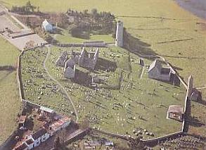 | (Retreat of the Sons of the Noble.) More>>> This monastery is situated on the banks of the Clonmacnoise was the burial place of the kings of Connaught and of Tara, the last high king of Ireland Rory O'Connor was buried here in 1198 The monastery survived numerous attacks from Vikings and Norman's, it appears also that rivalry between the monasteries was not uncommon, one report from 764 states that 'Durrow monastery suffers 200 dead when it fights a pitched battle with the monks of Clonmacnoise'. Clonmacnoise was burned down in the year 1204 for the twenty sixth time. (Another source states 36 this may be a typing error) It was desecrated and destroyed in 1552 by the English garrison from Athlone. The ruins are the most extensive in Ireland, consisting of a Cathedral, eight churches, two round towers, three high crosses, two hundred grave slabs and a 13th century castle. The nuns church a 12th century Irish-Romanesque building with a simple church and only a knave and chancel. The chancel arch is carved with geometrical patterns in three orders. The church was built in 1167 by Dervorgilla, the wife of a Breifne chieftain Tiernan O'Rourke. Whose abduction by Dermot MacMurrough King of Leinster, was one of the contributary factors leading to the Anglo Norman invasion of Ireland Underwater in The Shannon near Clonmacnois archaeologists have found the remains of a wooden bridge, built in A.D. 804 it is 533 ft long anf 17 ft wide. More>>>