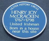 In 1796 the leaders, including Henry Joy and his brother, were arrested and spent fifteen months in Dublin's Kilmainham Jail, When the call to rise to arms came in June 1798, McCracken led the attack on Antrim where they were routed by the army, and he went into hiding. He was arrested near Carrickfergus, tried on the next day .in Belfast, and hanged that evening June 17th 1798 His sister Mary Ann accompanied him from the prison cell to the gallows .outside the Market House in Cornmarket. Mary Ann had a doctor waiting in case the body could be revived. He was buried in the nearby St Georges graveyard, High Street, but the remains were later re-buried in Clifton Street graveyard. See also the United Irishmen, and The 1798 Rebellion in Irish History |