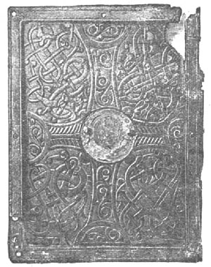 Learning of every kind was held in the highest estimation; and learned men were well rewarded, not only in the universal respect paid to them, but also in the solid worldly advantages of wealth and influence. Professional men physicians, lawyers, builders, &c. went on their visits, each attended by a group of scholars who lived in his house and accompanied him to learn their profession by actual practice. Some gave themselves up to the study and practice of art in its various forms, and became highly accomplished: and specimens of their artistic work remain to this day, which are admitted to be the most perfect and beautiful of the kind existing in any part of the world. In numerous districts there were minerals, which, though not nearly so abundant as in the neighbouring island of Great Britain, were yet in sufficient quantity to give rise to many industries. The mines were worked too, as we know from ancient documents; and the remains of old mines of copper, coal, and other minerals, with many antique mining tools, have been discovered in recent times in some parts of Ireland. Gold was found in many places, especially in the district which is now called the county Wicklow; and the rich people wore a variety of gold ornaments, which they took great pride in. Many rivers produced the pearl mussel, so that Ireland was well known for its pearls, which were unusually large and of a very fine quality: and in some of the same rivers pearls are found to this day. FIG. 4. Specimens of the Ancient Irish Art of Bookbinding.